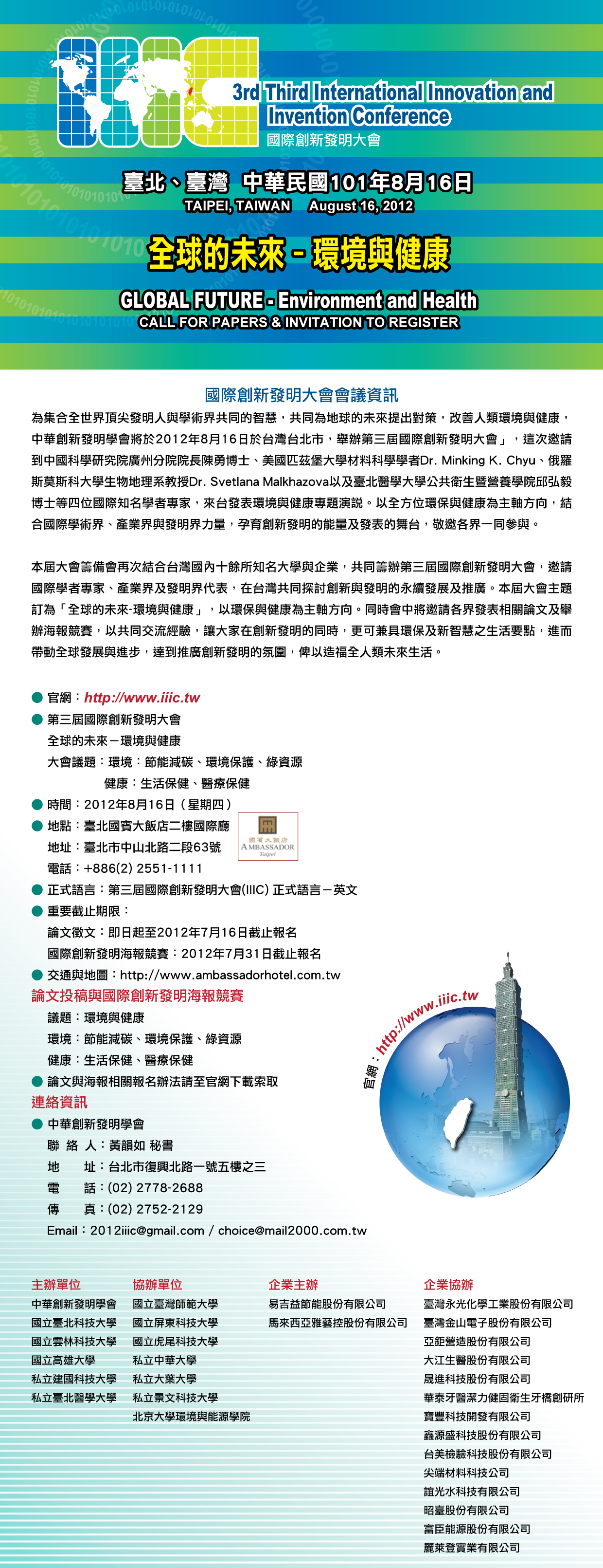 三、『2012第三届国际创新发明大会』举办时间2012年8月16日(四),地点:台北国宾大饭店二楼国际厅。论文投稿(免报名费),国际创新发明海报竞赛(报名费6,000元/件)。