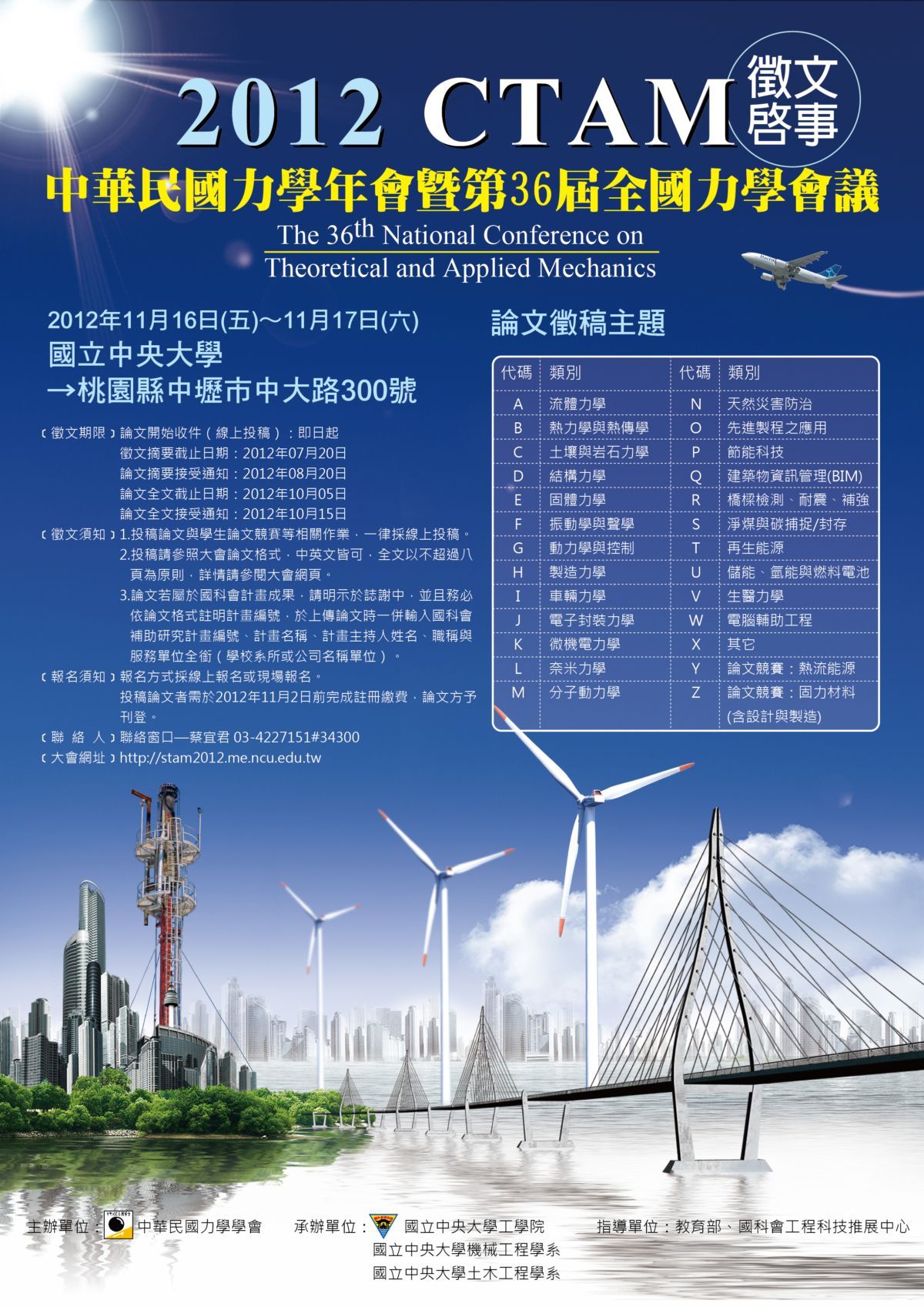 一、「中华民国力学学会年会暨第三十六届全国力学会议」仅订于101年11月16日至101年11月17日假中央大学工学院馆举行。本届年会由中华民国力学学会年会主办,中央大学工学院承办。