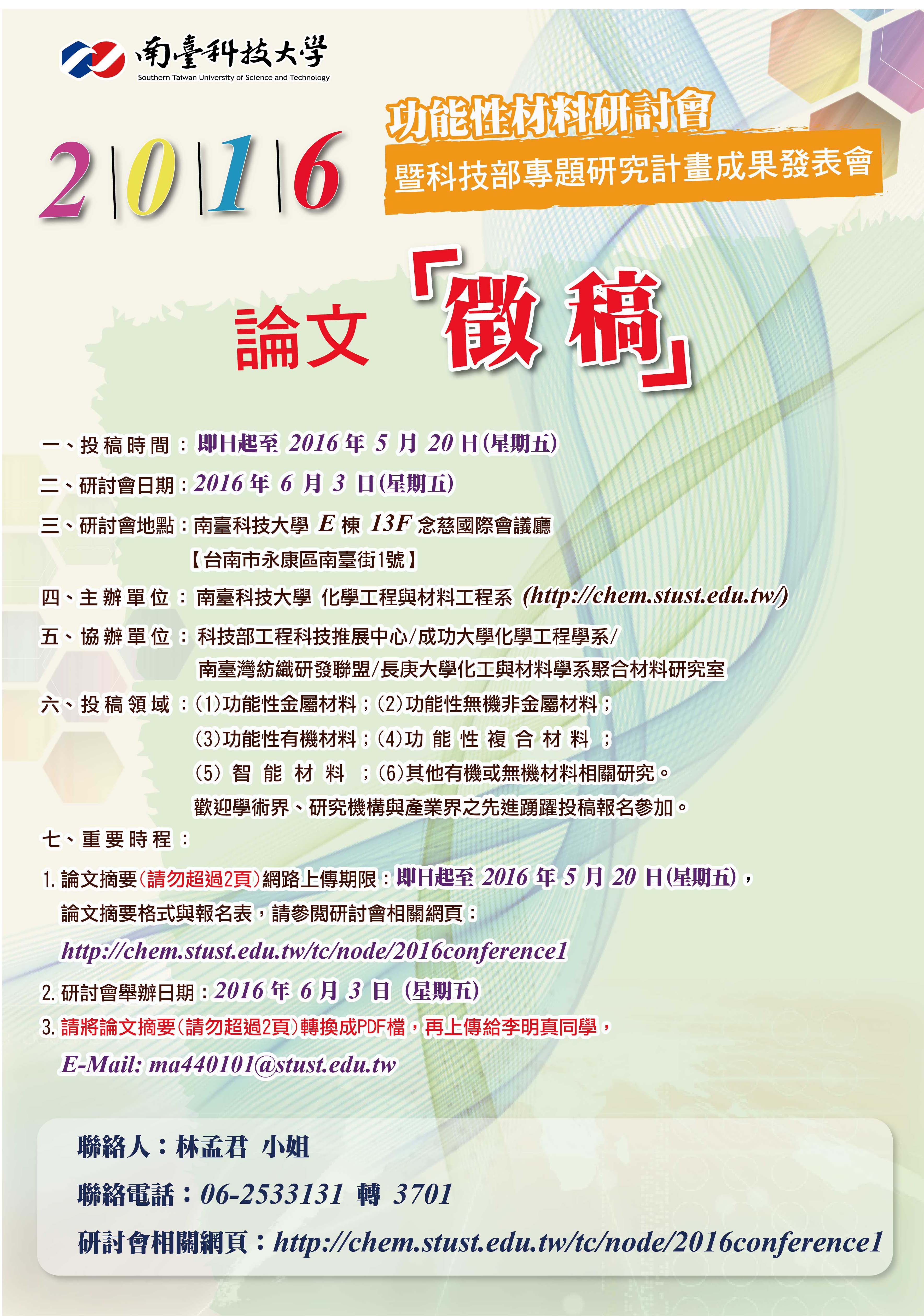 四、附件为『 2016年功能性材料研讨会暨科技部专题研究计画成果发表会』征稿海报,请参阅。